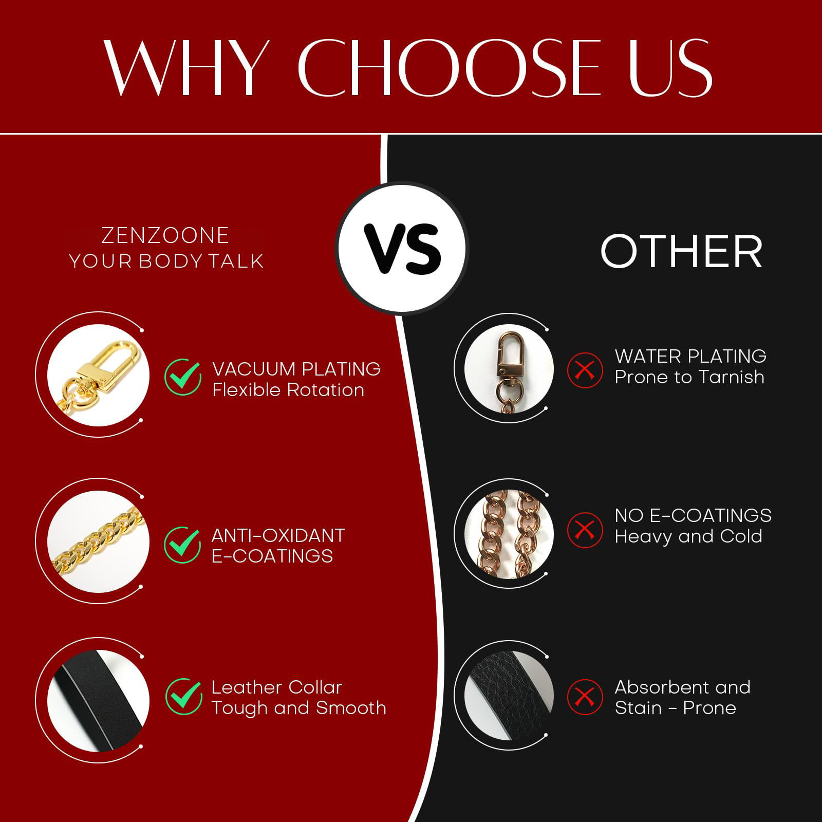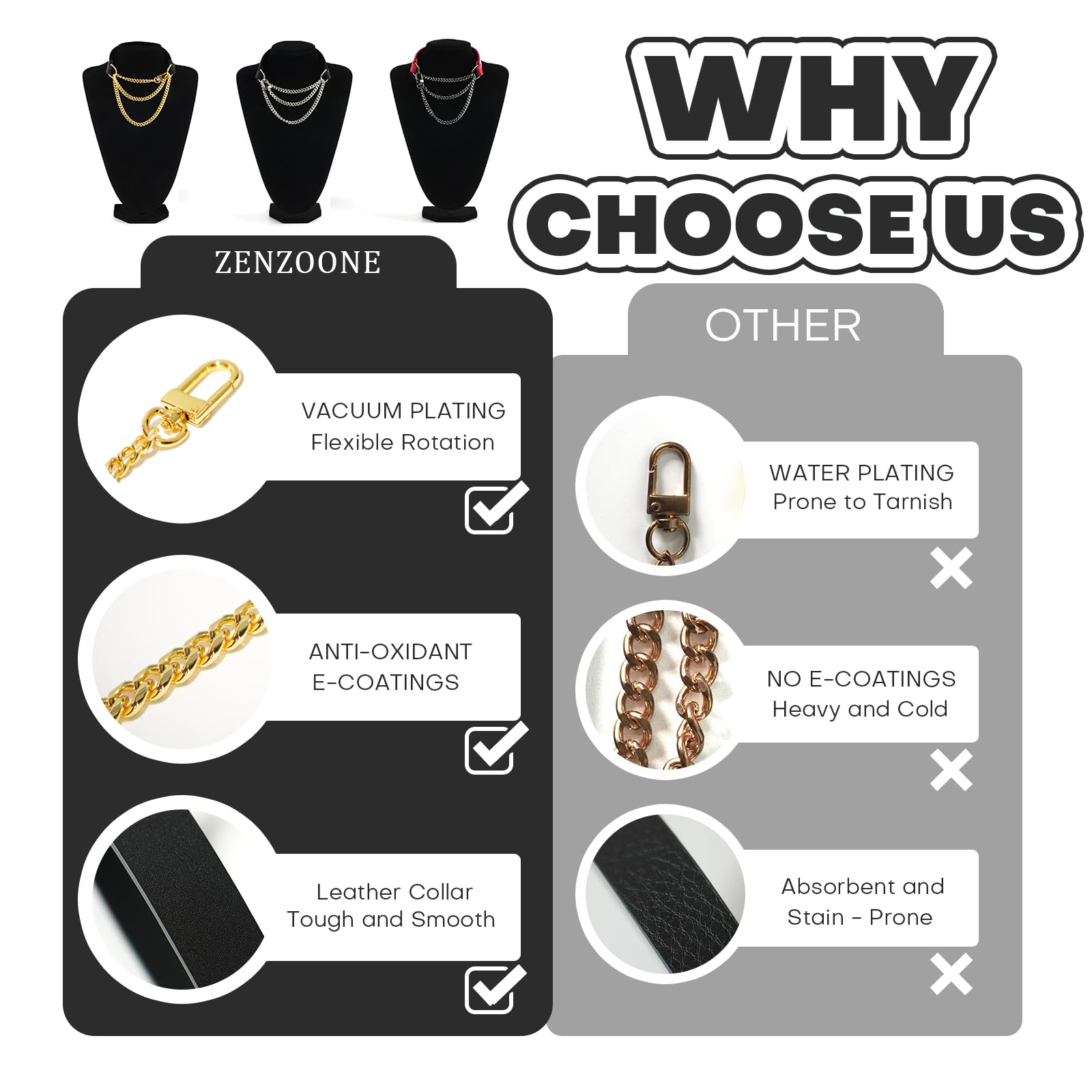 Unique Design: This avant-garde choker is made of imported first-layer cowhide and sturdy metal chain. Hypoallergenic, fade-resistant and non-oxidizing for long-lasting wear.
